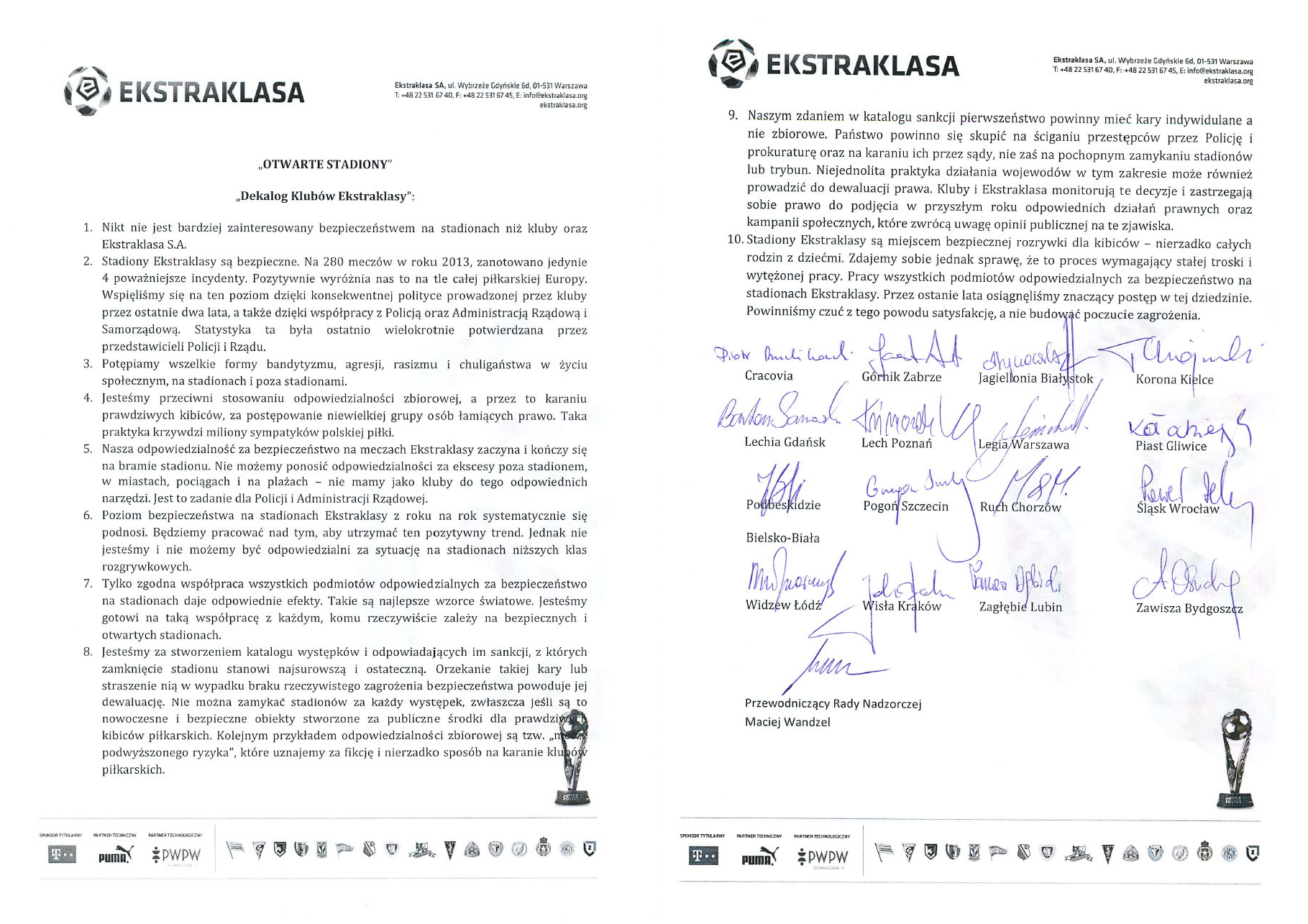 Administracja państwa zamiast karać sprawców zabronionych czynów, stosuje odpowiedzialność zbiorową – nakłada kary na kluby pozbawiając ich wpływów z biletów. Mści się też na tych kibicach, którzy rac nie odpalają, a nie mogą oglądać meczów swoich drużyn. O tym wszystkim we wspólnym, dziesięciopunktowym oświadczeniu, zwanym dekalogiem, piszą prezesi wszystkich klubów.